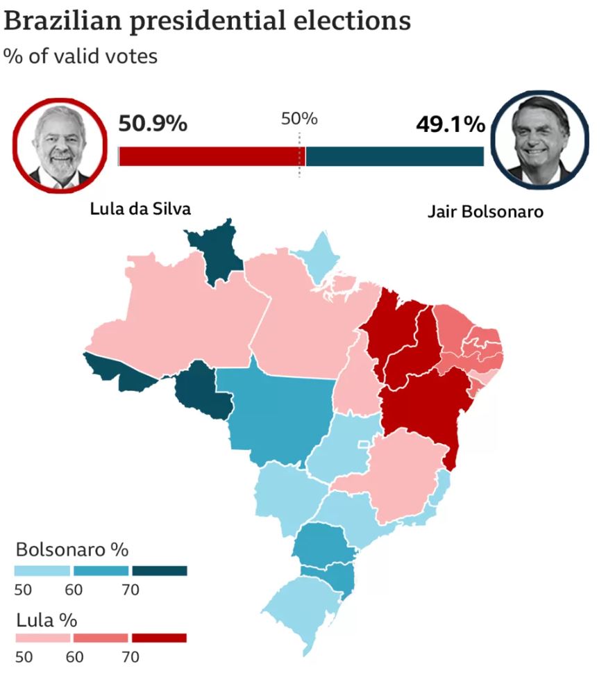 Brazili bën një kthesë majtas. Ish-presidenti Luiz Inácio Lula da Silva mundi në zgjedhjet presidenciale, presidentin aktual të ekstremit të djathtë Jair Bolsonaro. Pas një fushate përçarëse, e cila pa dy rivalë të hidhur në anët e kundërta të spektrit politik të përballen kokë më kokë, Lula fitoi 50.9% të votave.