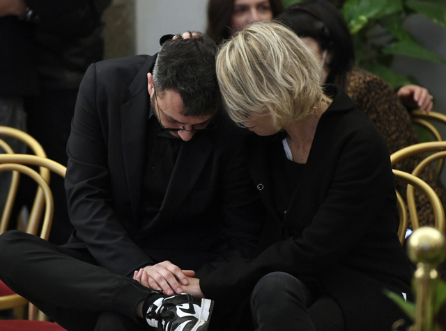 Bashkëshortja e tij, Maria De Filippi dhe djali i birësuar i çiftit, Gabriele, i cili në të shumtën e kohës, ishte i përlotur, u ulën në rreshtin e parë të karrigeve për të afërmit dhe miqtë. Prezantuesja, e veshur me kostum dhe syze të zeza, shihej vazhdimisht të fliste me djalin e saj për ta ngushëlluar.