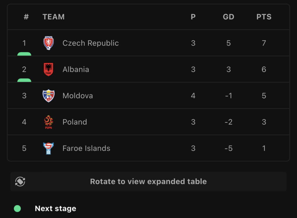 Pas 3 ndeshjeve në kualifikuese, Shqipëria ndodhet në vendin e dytë në Grupin E me 6 pikë, 1 më pak se Çekia e vendit të parë.