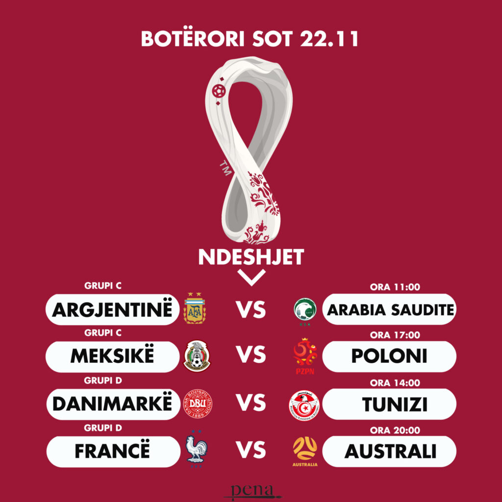 Pra, Argjentina këtë të martë, zbret në fushë në orën 11:00 në “Lusail Stadium” kundër Arabisë Saudite, ndeshje e vlefshme për grupin C. Po ashtu për këtë grup në “Stadium 974” në orën 17:00 do të përballet Meksika me Poloninë, ndeshje e cila në letër konsiderohet një ndeshje e ekuilibruar por mos të harrojmë Lewandowski-n i cili mund ta prishë këtë ekuilibër me cilësitë e tij.
