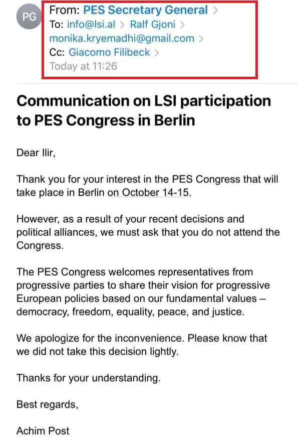 “I dashur Ilir, Faleminderit për interesin tuaj në Kongresin e PES, që do të mbahet në Berlin në 14-15 tetor. Gjithsesi, si rezultat i vendimit dhe aleancës suaj të fundit politike, ne ju kërkojmë që të mos merrni pjesë në Kongres. Kongresi i PES pret prezantime nga parti progresiste për të shpërndarë vizionin e tyre për politikat Europiane që janë të bazuara në vlerat tona thelbësore, demokracia, liria, barazia, paqja dhe drejtësia. Ju kërkojmë ndjesë për shqetësimin. Ju luten kini parasysh që nuk ishte një vendim i lehtë”, thuhet në mesazh.