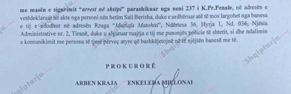 “… me masën e sigurimit “arrest në shtëpi” parashikuar nga neni 237 i Kodit të Procedurës Penale, në adresën e vetëdeklaruar në akte nga personi nën hetim Sali Berisha duke e urdhëruar atë të mos largohet nga banesa e tij e ndodhur në adresën rruga “Mustafa Matohiti”, duke u siguruar mbrojtja e tij me punonjës policie të shtetit si dhe ndalimin e komunikimit me persona të tjerë përveç atyre që bashkëjetojnë në të njëjtën banesë me të”- thuhet në kërkesën e zbardhur të SPAK.