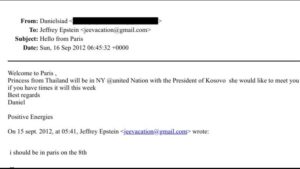 Në miliona dokumentet e dosjes Epstein të publikuar të premten 29 Janar nga Departamenti amerikan I Drejtësisë përmendet “Presidenti i Kosovës”. Në mesazhet e publikuara si pjesë të emailëve të shumta të Epstein, një person me emrin “Daniel”, identiteti i të cilit mbetet i panjohur, shkruan në datën 16 Shtator 2012: