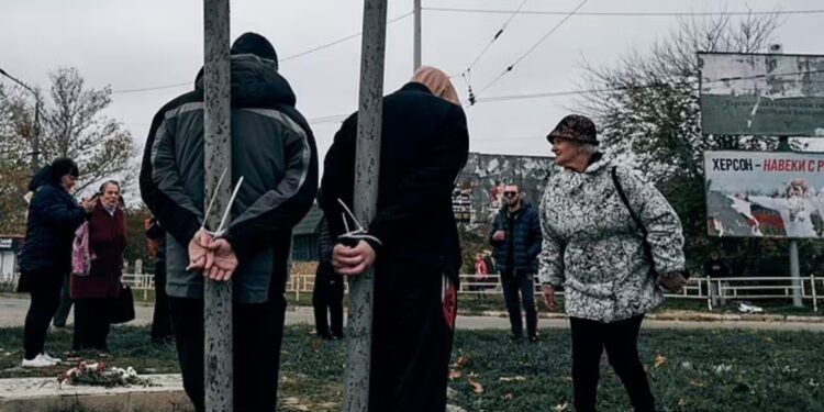 Dy persona u shfaqën të lidhur nga duart në mes të qytetit ukrainas, me qytetarët që kalonin pranë tyre dhe i thërrisnin ‘tradhtarë’, në pritje të ushtarëve që do të vendosnin për dërgimin e tyre në burg.