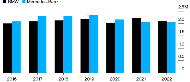 Dërgesat në mbarë botën të makinave të markës BMW ranë 5% në 2.1 milionë vitin e kaluar, duke lënë pas Mercedes, dërgesat e të cilit ranë 1% në 2.04 milionë. Ndërsa të dyja markat rritën shitjet në muajt e fundit të 2022, ato nuk mund të kompensonin biznesin e humbur gjatë gjysmës së parë, kur mungesat e pjesëve dhe lufta në Ukrainë ulën prodhimin.