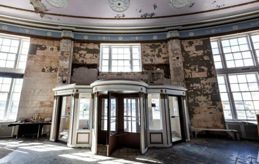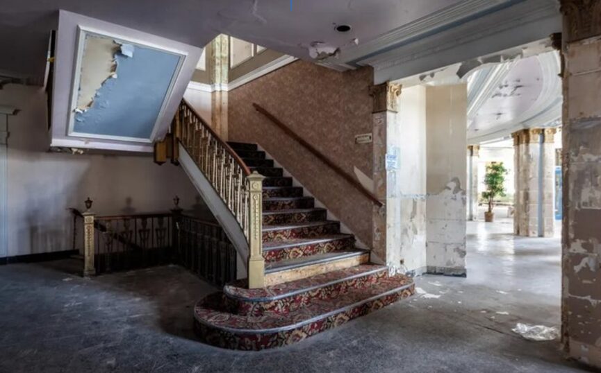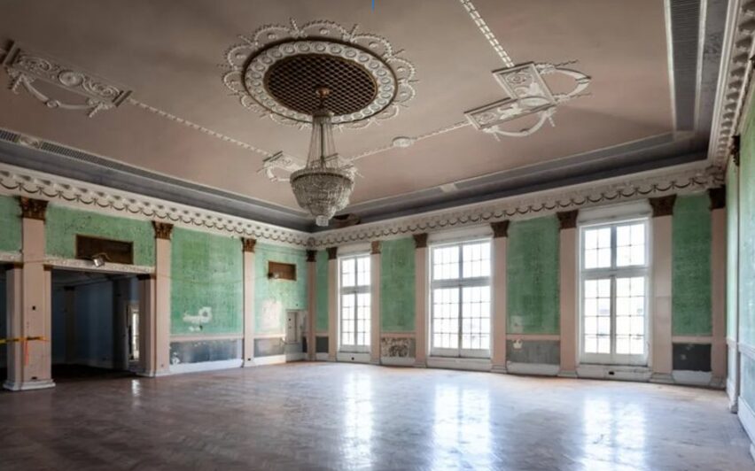 Pallati i ballove, ku organizoheshin mbrëmje madhështore, është shndërruar në një hapësirë të shkretuar, por llambadari kristal ende qëndron pezull. Dhomat janë boshatisur plotësisht, ndërsa muret dhe dyshemetë janë mbuluar nga pluhuri dhe rënia e bojës.