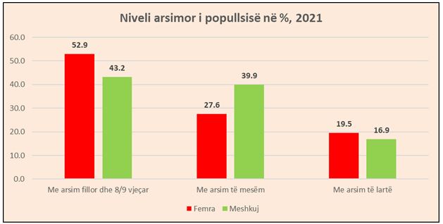 Sipas INSTAT, në vitin 2021, rreth 19.5% e femrave mbi 25 vjeç në vend e kishin mbaruar arsimin e lartë, përkundrejt 16.9% të meshkujve. Vitet e fundit, rritja e peshës së vajzave që zgjedhin të ndjekin universitetin është më e lartë sesa ajo e meshkujve.