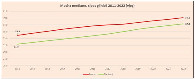 Mosha mediane e popullsisë në vendin tonë po rritet me ritme te shpejta nga viti në vit duke sinjalizuar plakjen e popullsisë. Përgjatë një viti mosha e mediane për të dy gjinitë gati u rrit me një vit, ndërsa në 10 vitet e fundit për gratë u rrit me 4.6 vite dhe për burrat me 5.5 vite.