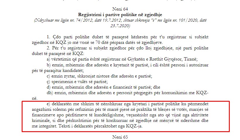 Ne pikën e të këtij neni thuhet se: deklaratën me shkrim të nënshkruar nga kryetari i partisë politike ku përmendet angazhimi solemn për refuzimin për të marrë pjesë në praktika të blerjes së votës, marrjes së financimeve apo përfitimeve të kundërligjshme, veçanërisht nga ato që vijnë nga aktivitete kriminale, si dhe përkushtimin për të konkurruar në zgjedhje në mënyrë të ndershme dhe me integritet. Teksti i deklaratës përcaktohet nga KQZ-ja.