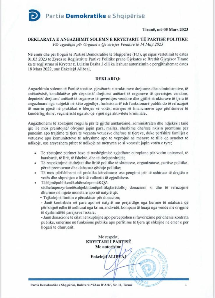 Partia Demokratike nuk u regjistrua sot nga Komisioneri i Zgjedhjeve sepse mungon një dokument shumë i rëndësishëm, deklarata e kryetarit të partisë me angazhimin për mos blerjen e votave. Deklarata njihet si një ‘përgjegjësi’ e kryetarit të Partisë dhe si e tillë duhet plotësuar vetëm nga ai. Deklarata parashikohet në nenin 64 të Kodit Zgjedhor ku radhitet dokumentacioni që duhet të paraqitet për regjistrimin e një partie politike. Dokumenti sipas Celibashit duhet të firmoset vetëm nga kryetari i Partisë dhe është përgjegjësi që nuk mund të delegohet.