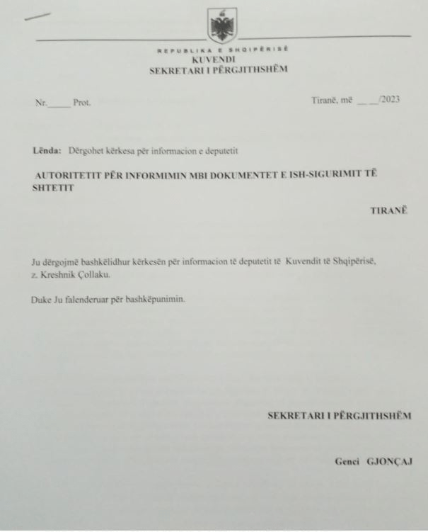 “Sot kam depozituar pranë zyrës së protokollit të Kuvendit kam paraqitur kërkesën time për të më vënë në dispozicion një kopje të dokumenteve . Nëse që nga marsi i91 deri më sot ka pasur bashkëpunëtorë apo elemente në shërim të ish bashkëpunëtoreve të sigurimit të shtetit.”- tha Çollaku.