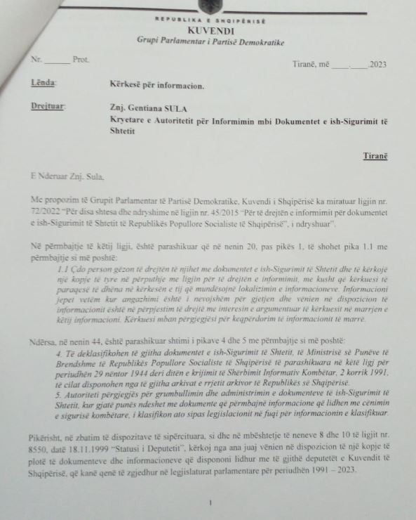 Me propozim të Grupit Parlamentar të Partisë Demokratike, Kuvendi i Shqipërisë ka miratuar ligjin nr. 72/2022 “Për disa shtesa dhe ndryshime në ligjin nr. 45/2015 “Për të drejtën e informimit për dokumentet e ish-Sigurimit të Shtetit të Republikës Popullore Socialiste të Shqipërisë”, i ndryshuar”.