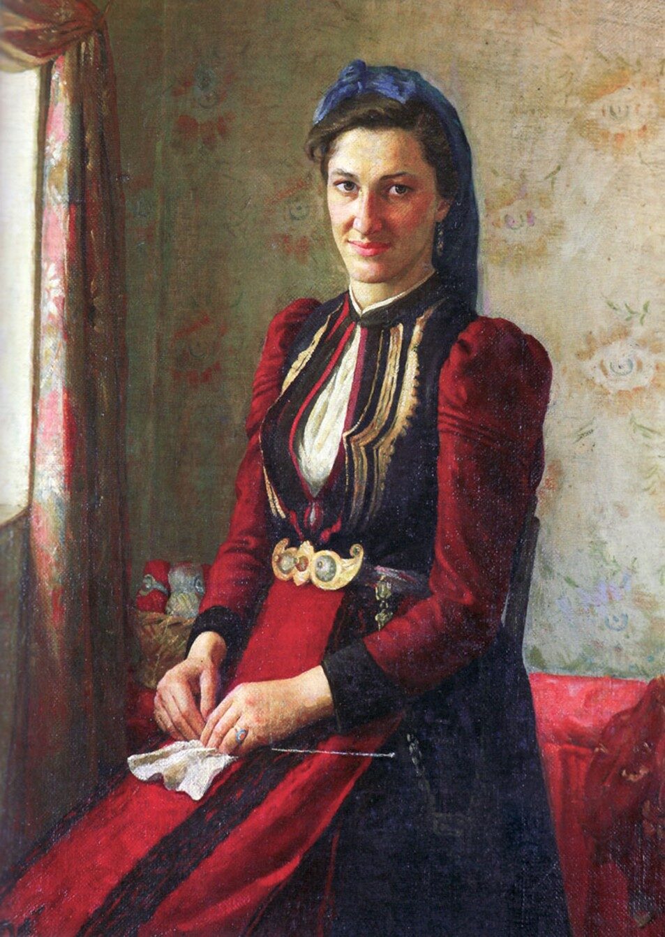 “Viti 1956. Shqipëria kishte pak kohë që ishte pranuar në OKB. Reiz Malile, funksionar në Ministrinë e Jashtme, më takoi dhe më bëri një kërkesë për realizimin e shpejtë të një tabloje që do të vendosej në selinë tonë diplomatike në Nju Jork. Duhej diçka e bukur dhe dinjitoze. Unë, në dilemë mes një natyre të qetë, peizazhi dhe një kompozim, vendosa që tabloja të kishte si personazh një vajzë me kostum kombëtar që do ta përfaqësonte mirë Shqipërinë kur të vendosej atje. Shkova në gardërobën e Teatrit Kombëtar për të gjetur kostumet e të gjitha krahinave dhe për të zgjedhur më të bukurin. Ishin origjinale, siç i kishin punuar gratë fshatare apo malësore, me ngjyra të forta, prerje elegante, larmi të pafundme formash. Gruaja ime, atë kohë, ishte nuse e re dhe e bukur, e gjatë e me tipare të zeza e të theksuara. I provoi të gjitha kostumet që solla në shtëpi. Njëri më i bukur se tjetri. I shkonin shumë ato të veriut sidomos xhubleta prej shajaku, me atë hapjen e bukur si këmborë e valëzuar. Nxirrte një tors të mrekullueshëm, të plotë, të fuqishëm. Por i jepte një pamje disi të egër, të ashpër, heroike. Nuk përputhej me përfytyrimin që kisha skicuar në mendje. Më vinte keq të largohesha nga ai kostum, por duke kërkuar e provuar më tërhoqi vëmendjen kostumi popullor i fshatit Dardhë të rrethit të Korçës. E mora në dorë dhe e kundrova gjatë. Ishte shumë i bukur, elegant, shamia e kokës e lehtë, e ndezur në ngjyrë, fustani i punuar hollë e me hijeshi. I gjithë kostumi ka një gamë koloristike dhe një hijeshi të mrekullueshme. Delikatesa e linjave shkrihej me trupin. Ai kërkonte një portret të ëmbël të hijshëm që të nxirrte në dukje transparencën dhe zhdërvjelltësinë e formave të trupit. Këtë do të pikturoj, e vendosa. Si fillim i them gruas që ta provonte. Kostumi ishte i bukur, fin por jo për gruan time. Nuk i shkonte, nuk përshtateshin, nuk jetonin në harmoni… Isha tërësisht në krah të kostumit të fshatit Dardhë që i përshtatej më mirë idesë sime. Por me modelin si t’ia bëja? Ku ta gjeja? Shkuam në Ansamblin e këngëve dhe valleve popullore, pashë shumë vajza të reja, këngëtare, balerina. Bëra disa prova me to, por ajo që përzgjodha ishte një studente. Erdhi në studio, te Kinema “Ali Demi”, veshi kostumin, bëra me laps në letër disa skica. Ishte mrekulli, rrinte mirë si model…”