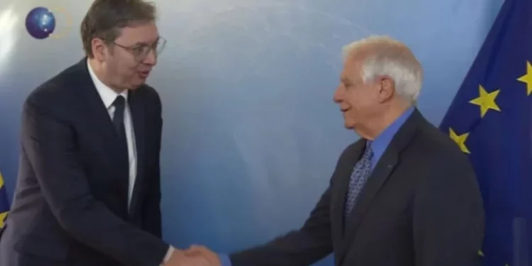 Presidenti i Serbisë, Aleksandar Vuçiç, po zhvillon një takim me ndërmjetësuesit europianë të bisedimeve për normalizimin e marrëdhënieve midis Prishtinës dhe Beogradit.