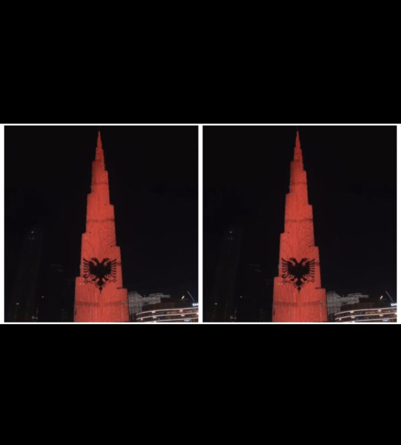 Kulla më e lartë në botë, “Burj Khalifa” që gjendet në Dubai, u “vesh” pasditen e së hënës me ngjyrat e flamurit Kuq e Zi.