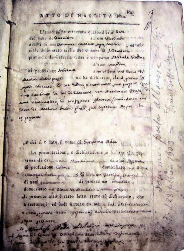 Jeronim De Rada do të ndërmendet në detyresën e gjeneratave si një personalitet që tejkaloi çdo përkufizim. Ai diti dhe mundi të jepej me mish dhe me shpirt të epërmeve virtyte, të shenjtave obligime. Gjithçka përmbledhtaz përbën aktin e tij si kontributor i atdhetarizmë është thelbësisht misioni i një shenjtori. Edhe pse ai nuk ishte i shuguruar si i tillë, kujtesa e vlerave dhe veprës që la trashëgim i ngritën atij një altar, një predikuese të shqiptarizmës, një gjunjëzore përtëritjesh shpirtërore. Ai luajti një rol dritonjës në historinë e letërsisë shqiptare. Ishte nistori i veprës letrare me frymë kombëtare. Ndikimi i tij mbi shkrimtarët arbëreshë bashkëkohës ishte i madh. Tradita poetike e shkruar prej tij vijon të jetojë e përtërirë edhe në letërsinë e sotme arbëreshe. Jeronim De Rada ishte poeti i kumbimeve profetike brenda panteonit të letërsisë botërore, shqipkumtuesi i zëshëm i vlerave evropiane, dritëlëshuesi mbi terrin e kahershëm të kumteve shpirtërore të arbrit. Jeronim de Radës (Girolamo de Rada), poeti, publicisti, folkloristi, filologu dhe mësuesi, themeluesi i letërsisë dhe i kulturës arbëreshe u lind më 19 nëntor 1814 dhe vdiq më 28 shkurt 1903.