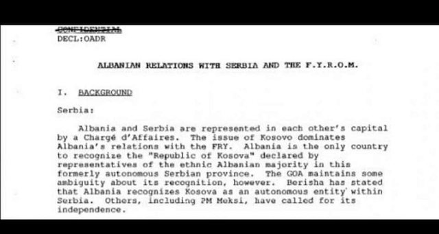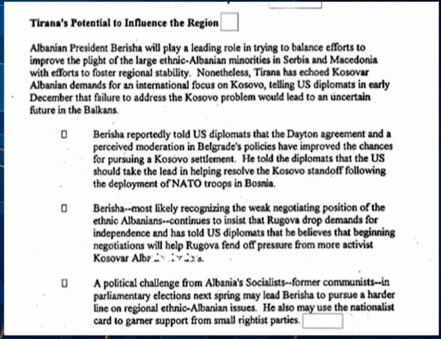 Një dokumenti tjetër i CIA-s për qëndrimet e Berishës ndaj çështjes kosovare, u deklasifikua si dokument sekret, muajin e shkuar. Aty flitet për mundësitë për konflikte në Ballkan, dhe në kapitullin “Potenciali i Tiranës për të ndikuar në rajon” aktori kryesor i mbajtur nën vëzhdim, është Sali Berisha.