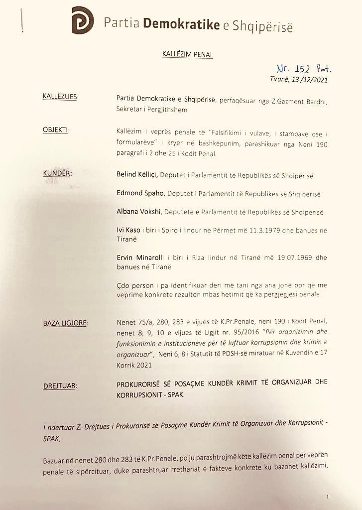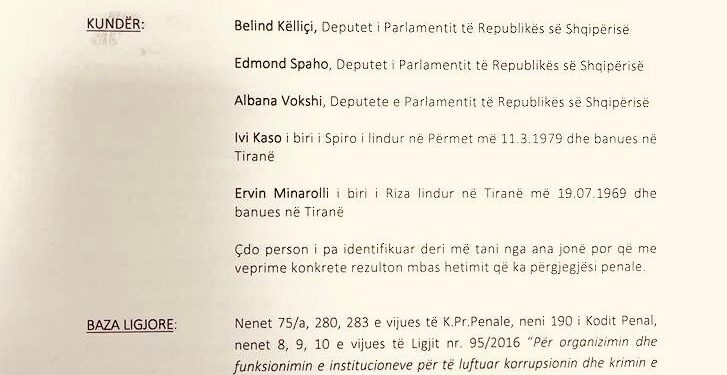 Sipas dokumentit zyrtar të kallëzimit penal (foto ilustruese), Gaz Bardhi nuk ka kallëzuar vetëm Belind Këlliçin, por edhe figura të tjera të njohura të PD-së si Edmond Spaho, Ivi Kaso, Albana Vokshi dhe Ervin Minarolli.