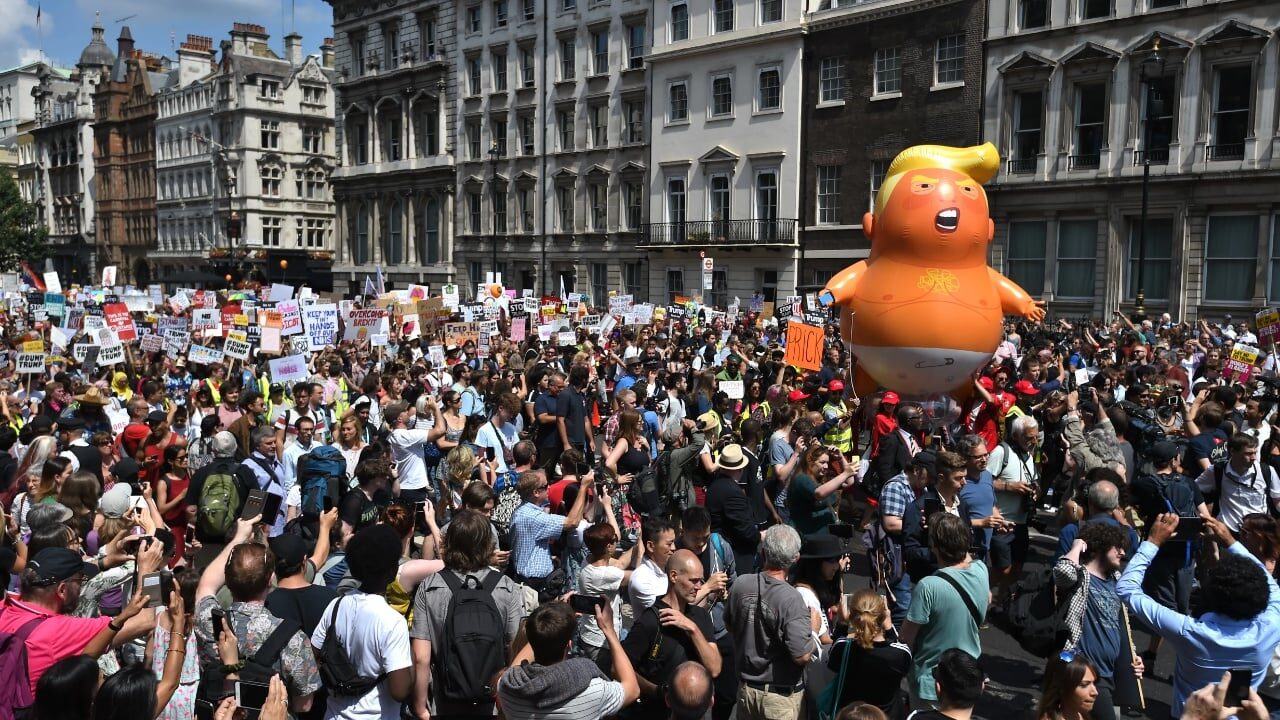 Ndërkohë që pritet ulja e avionit të Presidentit të shoqëruar nga gruaja e tij Melania, protestuesit e kanë shoqëruar kryengritjen e tyre me sloganin: “Thuajeni me zë të lartë, thuajeni qartë, Donald Trump nuk është i mirëpritur këtu”.