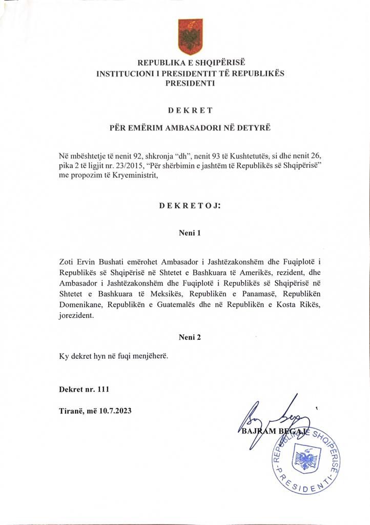 9. Emërohet me Dekret nr. 111 datë 10.7.2023 z. Ervin Bushati Ambasador i Jashtëzakonshëm dhe Fuqiplotë i Republikës së Shqipërisë në Shtetet e Bashkuara të Amerikës, rezident, dhe Ambasador i Jashtëzakonshëm dhe Fuqiplotë i Republikës së Shqipërisë në Shtetet e Bashkuara të Meksikës, Republikën e Panamasë, Republikën Domenikane, Republikën e Guatemalës dhe në Republikën e Kosta Rikës, jorezident.