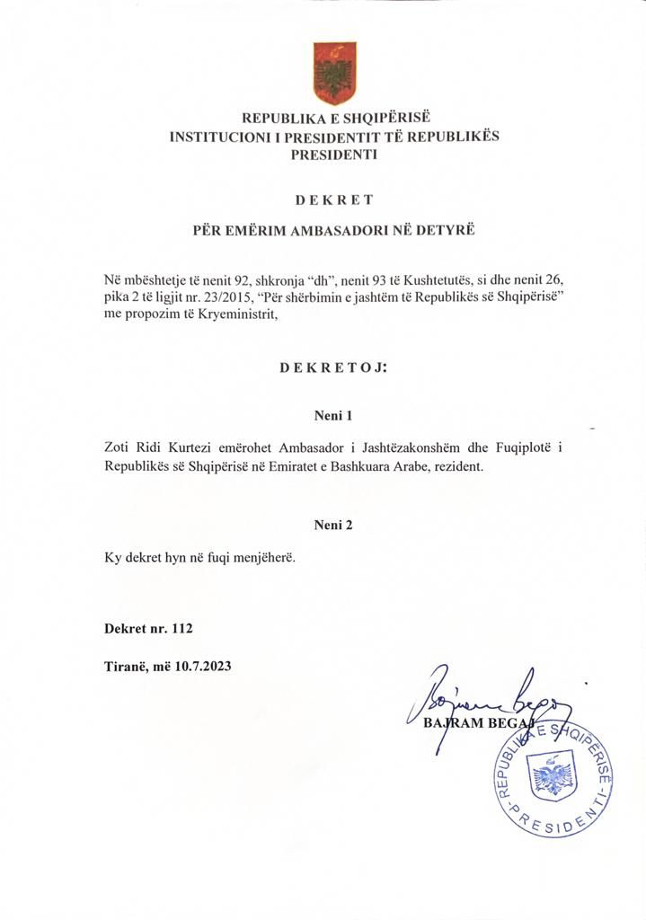 10. Emërohet me Dekret nr. 112 datë 10.7.2023 z. Ridi Kurtezi Ambasador i Jashtëzakonshëm dhe Fuqiplotë i Republikës së Shqipërisë në Emiratet e Bashkuara Arabe, rezident.
