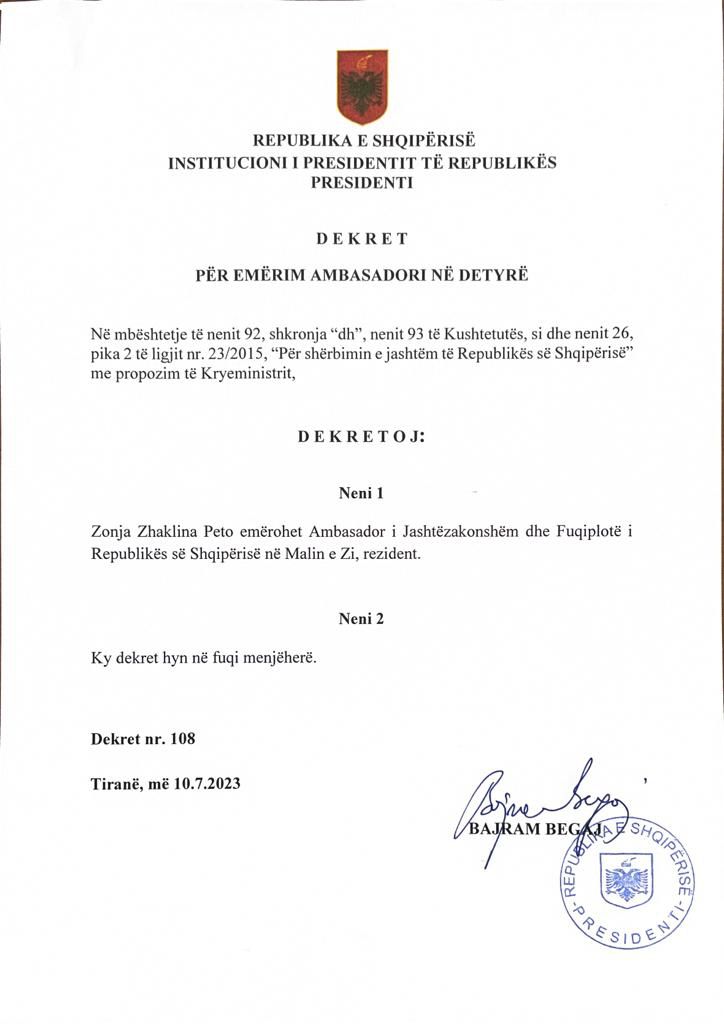 6. Emërohet me Dekret nr. 108 datë 10.7.2023 znj. Zhaklina Peto, Ambasador i Jashtëzakonshëm dhe Fuqiplotë i Republikës së Shqipërisë në Malin e Zi, rezident.