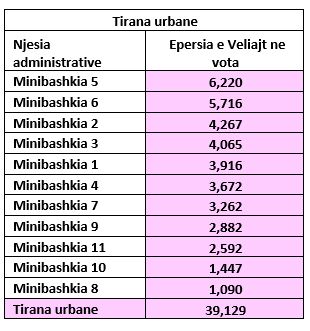 Në zonën origjinale urbane (në 11 ish-minibashkitë) kishte një korelacion të fortë statistikor mes madhësisë së njësisë administrative dhe epërsisë së Veliajt ndaj Këlliçit. Më thjeshtë, sa më e madhe ishte njësia, aq më e madhe ishte epërsia (shihni tabelën e mëposhtme)