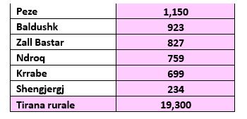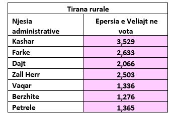 Në zonën rurale (në ish-komunat) kishte gjithashtu një korelacion të fortë statistikor mes madhësisë së njësisë administrative dhe epërsisë së Veliajt ndaj Këlliçit. Më thjeshtë, sa më e madhe ishte njësia, aq më e madhe ishte epërsia (shihni tabelën e mëposhtme)