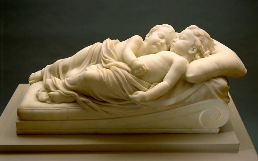 Mjeshtri William Henry Rinehart (13 shtator 1825 – 28 tetor 1874), skulptori i njohur amerikan, i konsideruar si “skulptori i fundit i rëndësishëm amerikan që ka punuar në stilin klasik”, e përcjell këtë moment me një delikatesë të mahnitshme. Fëmijët, bukurinë e tyre delikate dhe të kulluar i gjejmë përgjatë gjithë historisë së artit, nga zakonshmëria e jetës së shkujdesur të një fëmije, deri te engjëjt. Ata janë kudo me një bardhësi prej drite dhe dëshmim të fuqishëm të triumfit të jetës.
