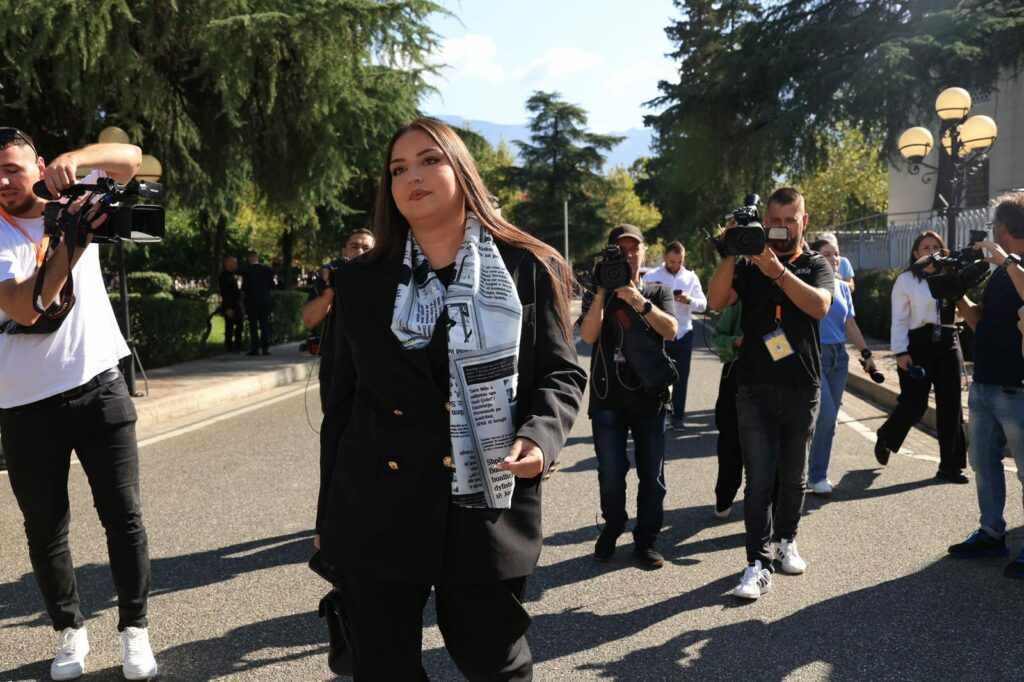 Në fotot e shkrepura nga LSA, ligjvënësit duket teksa futen në Kuvend, dhe vëmendjen e mori Sara Mile, me shallin e “pikturuar” me sharjet që mori gjatë fushatës elektorale.