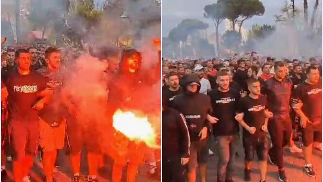 FOTO/ Shqipëri-Gjeorgji! “Tifozët Kuq e Zi” elektrizojnë kryeqytetin, çfarë ndodhi mes dy tifozerive