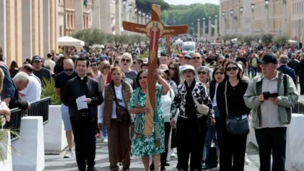 Turma të mëdha njerëzish janë mbledhur në sheshin e Shën Pjetrit, në qytetin e Vatikanit, për të bërë nderimet e tyre.