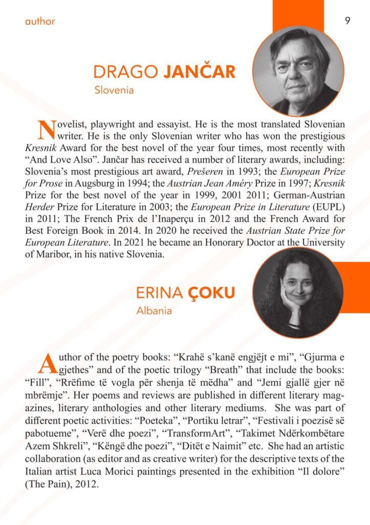 Autorët pjesëmarrës, fitues të EUPL: Drago Jančar , Tom Kuka, Kalin Terziyski, Reka Man-Varhegy si dhe autorët e përvojës dhe çmimeve ndërkombëtare : Dragan Velikićaj (Serbi), Vladislav Bajac (Serbi), Nikola Madzirov (Maqedonia e Veriut), Gjoko Zdraveski (Maqedonia e Veriut), Sebnem Isiguzel (Turqi) , Ervina Halili (Kosovë), Janis Kalpuzos (Greqi), Azem Deliu (Kosovë), Mimoza Hysa, Besnik Mustafaj, Rita Petro, Ylljet Aliçka, Ayfer Tunc (Turqi), Arbër Selmani (Kosovë), Ag Apolloni (Kosovë), Andreas Dushi, Alban Tufa, Brajan Sukaj, Erina Çoku, Diana Çuli, Stefan Çapaliku, Ivana