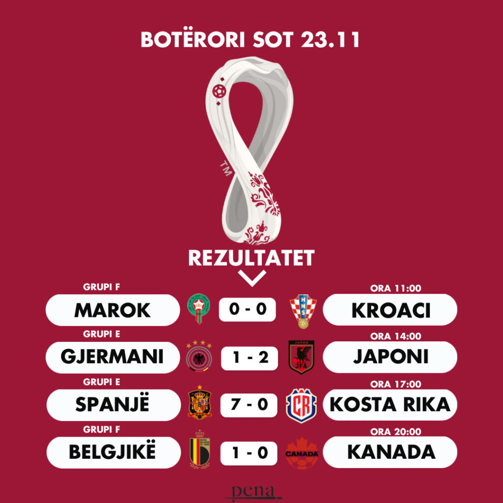 Dita e katërt e Botërorit patjetër qe do të sjellë me vete emocione dhe tronditje ku padyshim humbja e Gjermanisë 1-2 ndaj Japonisë ka luhatur pozitat e saj në një grup shumë delikat në të cilin ndodhet dhe Spanja e cila nga ana tjetër zhvilloi një ndeshje “stërvitore” duke mundur Kosta Rikën 7-0. Kroacia ngec ndaj Marokut dhe i jep mundesinë Belgjikës të marrë kreun e Grupit F pasi mundi Kanadanë minimalisht 1-0.