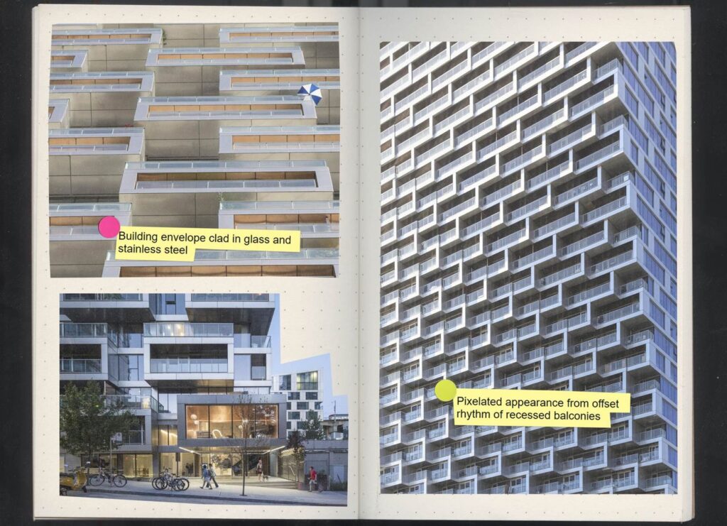 Aq të zakonshme janë kullat me perde të shndritshme në Vankuver, saqë ka fituar pseudonimin “Qyteti i qelqit”. Kjo vlen për afërsinë e menjëhershme rreth Shtëpisë së Vankuverit, me shumicën e ndërtesave aty pranë ose me xham ose një përfundim mat. BIG donte diçka ndryshe, një material që do të pasqyronte dritën e rrethinës së tij – veçanërisht qiellin dhe diellin, thotë Christoffersen. Arkitektët zgjodhën një fasadë shkëlqyese prej çeliku inox që kornizon ballkonet e vendosura të ndërtesës. Nga disa kënde nga afër, ajo i ngjan një koshere blete që shkëlqen.