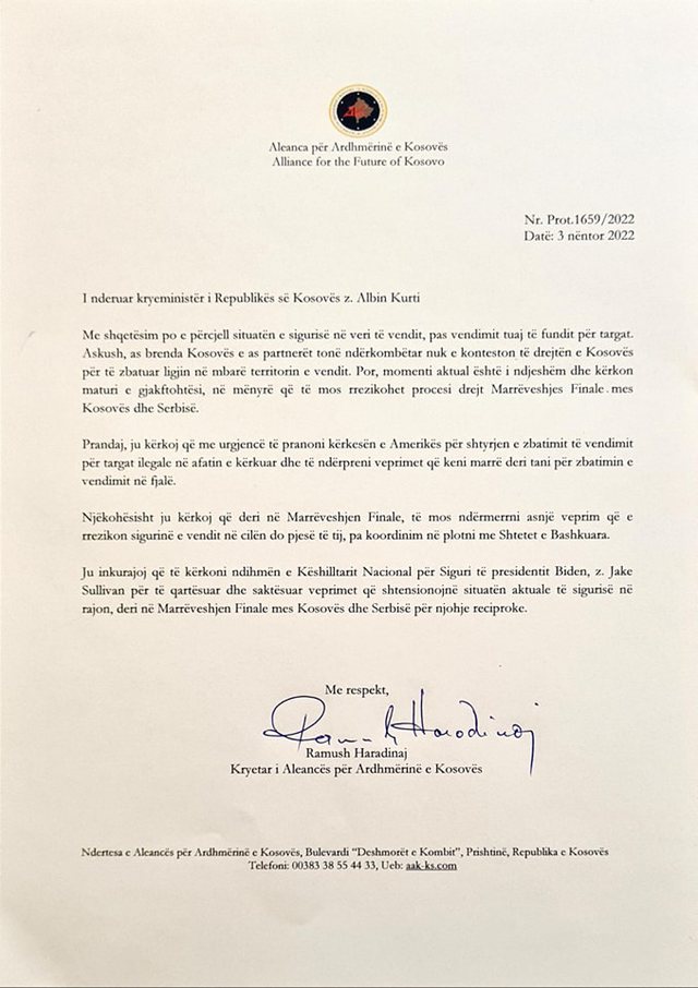 Por, momenti aktual është i ndjeshëm dhe kërkon maturi e gjakftohtësi, në mënyrë që të mos rrezikohet procesi drejt Marrëveshjes Finale mes Kosovës dhe Serbisë. Prandaj, ju kërkoj që me urgjencë të pranoni kërkesën e Amerikës për shtyrjen e zbatimit të vendimit për targat ilegale në afatin e kërkuar dhe të ndërpreni veprimet që keni marrë deri tani për zbatimin e vendimit në fjalë.