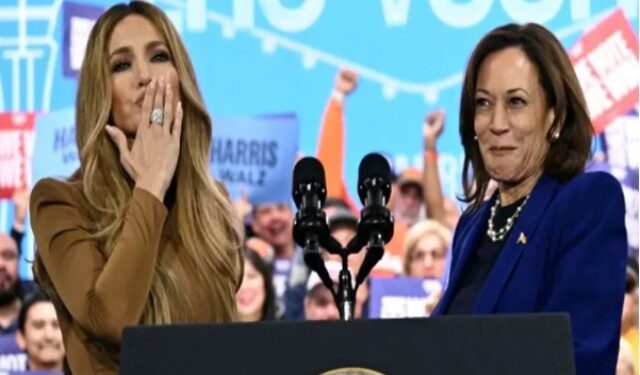 E ndërsa po mbante fjalën e sa kundrejt votuesve latinë (potencialisht vendimtarët në shtet), në skenë iu bashkua këngëtarja e njohur Xhenifer (Jennifer) Lopez.