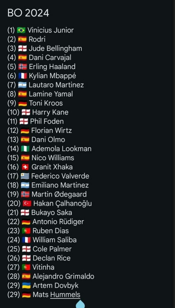 Por ndërkohë., në rrjet qarkullon prej orësh një listë e cila ka parashikuar me saktësi 20 emrat e parë të renditjes së këtij viti të “Topit të Artë”. Gjithçka në këtë listë është vërtetuar nga renditja nga vendi 11, deri në vendin 30. Por përkundër asaj që pretendon Reali, në këtë listë është emri i Vinicius në vendin e parë dhe jo i Rodrit.
