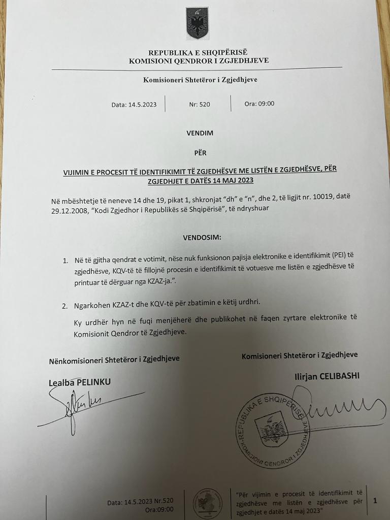 Duke ndjekur problematikat e krijuara në qendra të ndryshme të votimit me pajisjen e identifikimit biometrik ‘PEI’, KQZ ka urdhëruar që të vazhdohet me identifikimin e zgjedhësve me anë të listave të votimit të printuara.