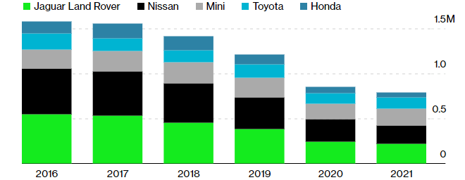 Shtytja shtrënguese e Mbretërisë së Bashkuar shton fyerjen ndaj dëmtimit të shkaktuar nga Brexit, i cili e zhyti vendin në një periudhë të zgjatur pasigurie dhe vonoi investimet në automobila. Gjatë 12 muajve që çuan në referendumin e 2016-ës, Britania prodhoi gati 1.7 milionë makina. Vitin e kaluar, prodhuesit e makinave kanë prodhuar më pak se gjysmën e kësaj.