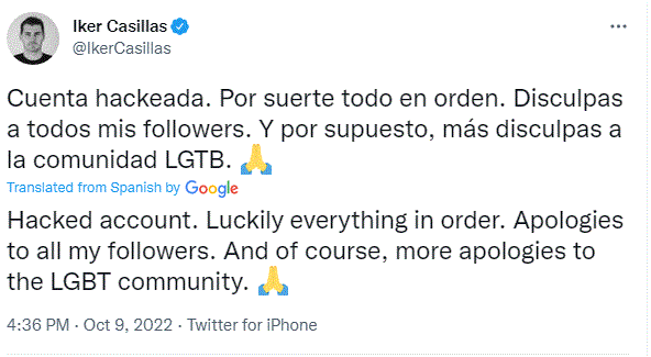 “Më hakuan llogarinë. Tanim gjithçka është në rregull. Një ndjesë për të gjithë ndjekësit e mi dhe sigurisht një kërkim ndjese të gjithë komunitetit LGBT”, shkruan Casillas.