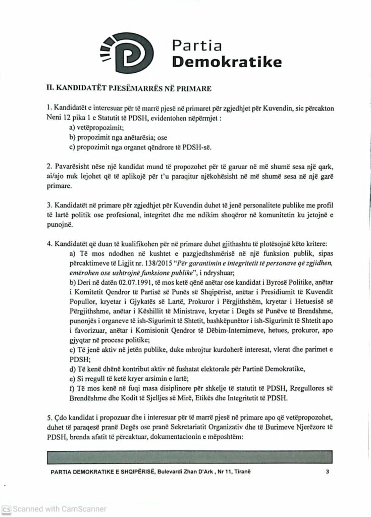 Udhëzimi parashikon që kandidatët për primare; vetëpropozohen, propozohen nga anëtarësia ose nga organet qendrore të Partisë Demokratike.