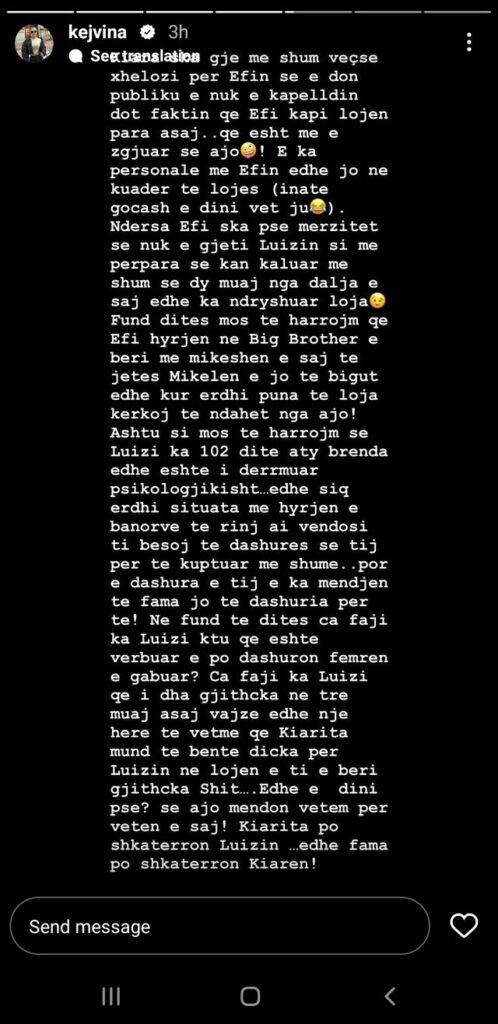 Kejvina shkruan në rrjete sociale se Kiara ka xhelozi për Efin që e kapi lojën shpejt dhe se ka mbështetje nga publiku.