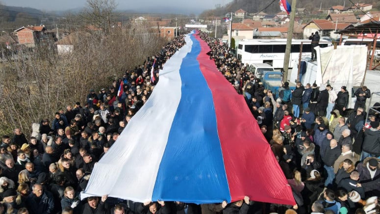 Serbët e Kosovës zhvilluan një protestë në Rudarë, ku janë vendosur barrikada prej disa ditëve. Duke shpalosur një flamur të Serbisë, 250 metra të gjatë, pjesëmarrësit lëshuan thirrje provokative si “Kosova është zemra e Serbisë” por edhe fyerje e ofendime ndaj kryeministrit të Republikës së Kosovës, Albin Kurti.