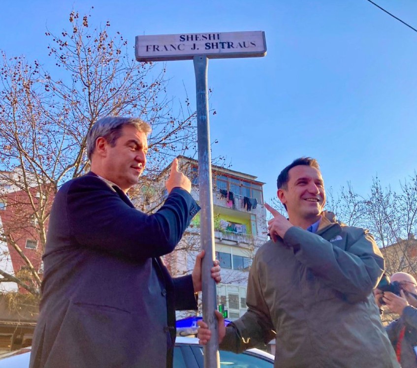 Kryeministri i Bavarisë, Markus Söder, e nisi vizitën e tij në Shqipëri me një takim me kryetarin e Bashkisë së Tiranës, Erion Veliaj. Krebashkiaku dhe Kryeministri Söder ishin në sheshin “Strauss”, i cili ka marrë emrin e atit të Bavarisë moderne, Franz Josef Strauss.