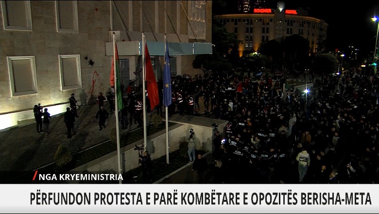 Protestuesit çajnë kordonin e policisë, hedhin bojë të kuqe në Kryeministri dhe ndezin qiri. Nderkohe policia ka ndaluar disa protestues te cilet kane goditur me mjete te forta dyert e kryeministrise.