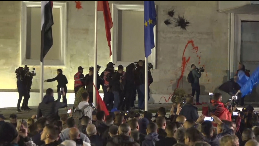 Sulmi me bojë të kuqe dhe të zezë në muret e godinës së kryeministrisë ndodhi fill pas përfundimit të fjalës së kryetarit të PD Sali Berisha.