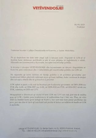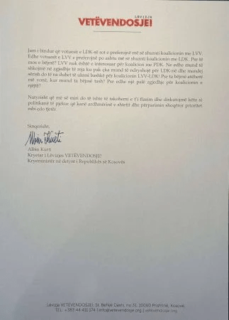 Kreu i LVV-së, në letër, nuk e ka përjashtuar as gatishmërinë e partisë së tij për shkuarje në zgjedhje të reja, por ka thënë se edhe ato do të çonin drejt një koalicioni mes LVV-së dhe LDK-së.
