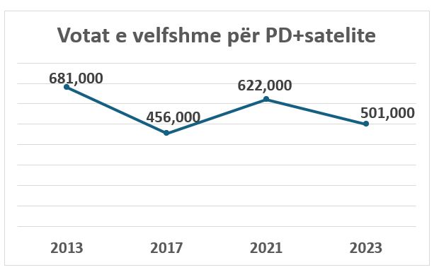 Kur Berisha ishte kryeministër, koalicioni i udhëhequr prej tij (PD+satelite) i humbi thellë zgjedhjet e 2013-ës, duke siguruar vetëm 681 mijë vota të vlefshme. Në zgjedhjet e 2017-ës, PD+satelite siguruan vetëm 456 mijë vota të vlefshme (rekordi më i ulët historik). Në zgjedhjet e 2021-shit, PD+satelite u ngjitën në shifrën e pamjaftueshme të 622 mijë votave të vlefshme. Ndërsa në zgjedhjet e 2023-shit, kandidatët e PD-së për kryebashkiakë (të përkrahur në terren nga PL, PR, PAA, etj) zbritën në shifrën e 501 mijë votave (shihni grafikun e mëposhtëm), duke patur përballë pothuaj 800 mijë vota të kandidatëve për kryebashkiakë të PS-së (që fituan në 54 nga 61 bashkitë).