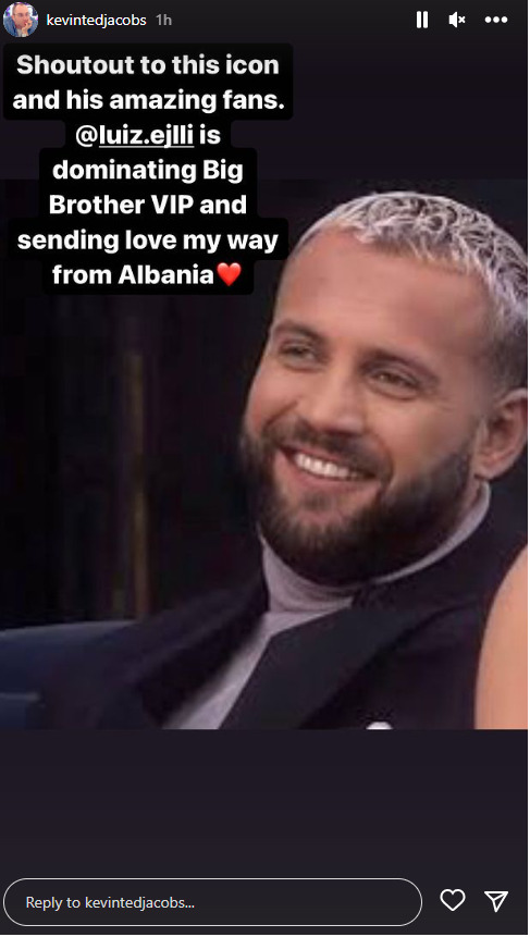Jacobs ka postuar në Instagram një foto të Luizit duke vlerësuar strategjinë e tij me një mesazh anglisht. “Përshëndes këtë ikonë dhe fansat e tij të mbrekullueshëm. Luiz Ejlli është duke dominuar Big Brother Vip, dërgoj gjithë dashurinë time drejt Shqipërisë”, shkruan ai.